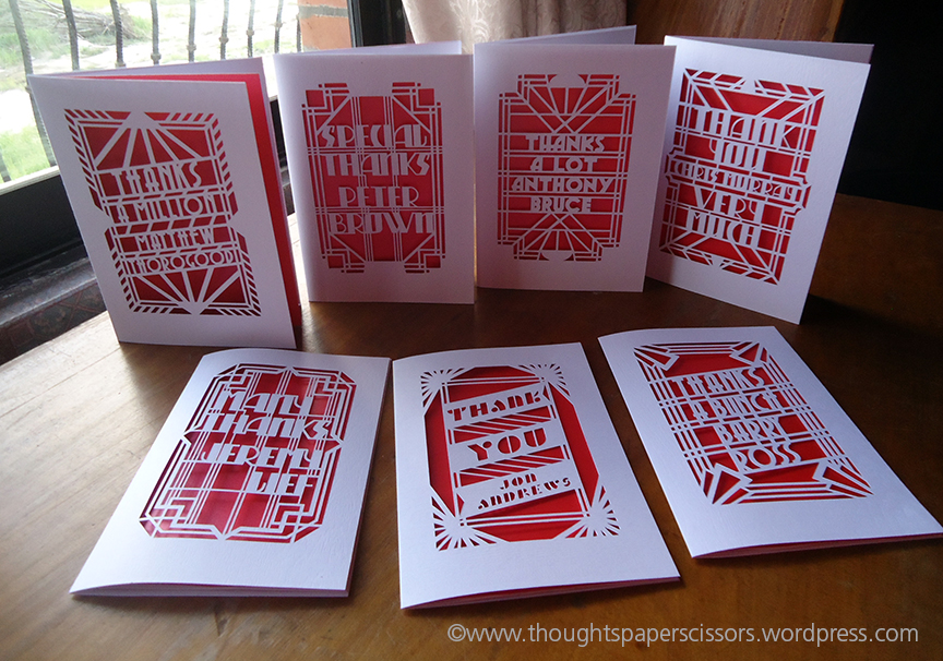I also said I’ll do a blog post on this so without further ado here are the products of that busy period. I’m going to show and talk you through the creation of 7 customised Thank You cards for a UK client.