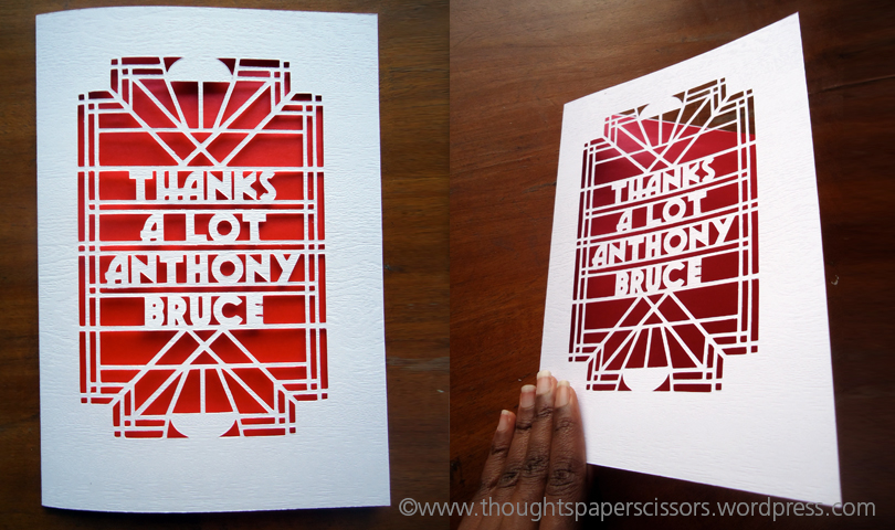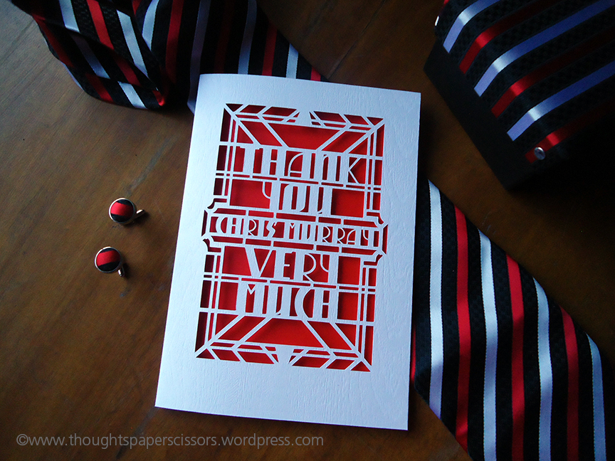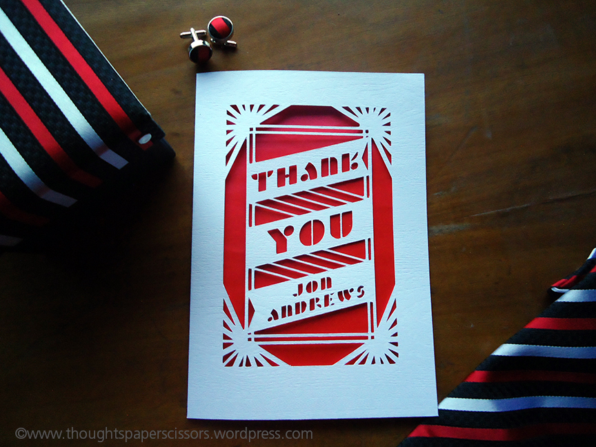These attributes were exactly what I wanted these cards to have. I therefore decided that the front of each card will be unique Art Deco pattern with a different thank you message tailored to each recipient which my client and I agreed on. In creating the cards I chose to use white wood embossed card with a red centura paper lining, to match one of the colours on  the company logo. Like I mentioned earlier there were seven cards in all each card was presented in its own individual gift box which I also made.